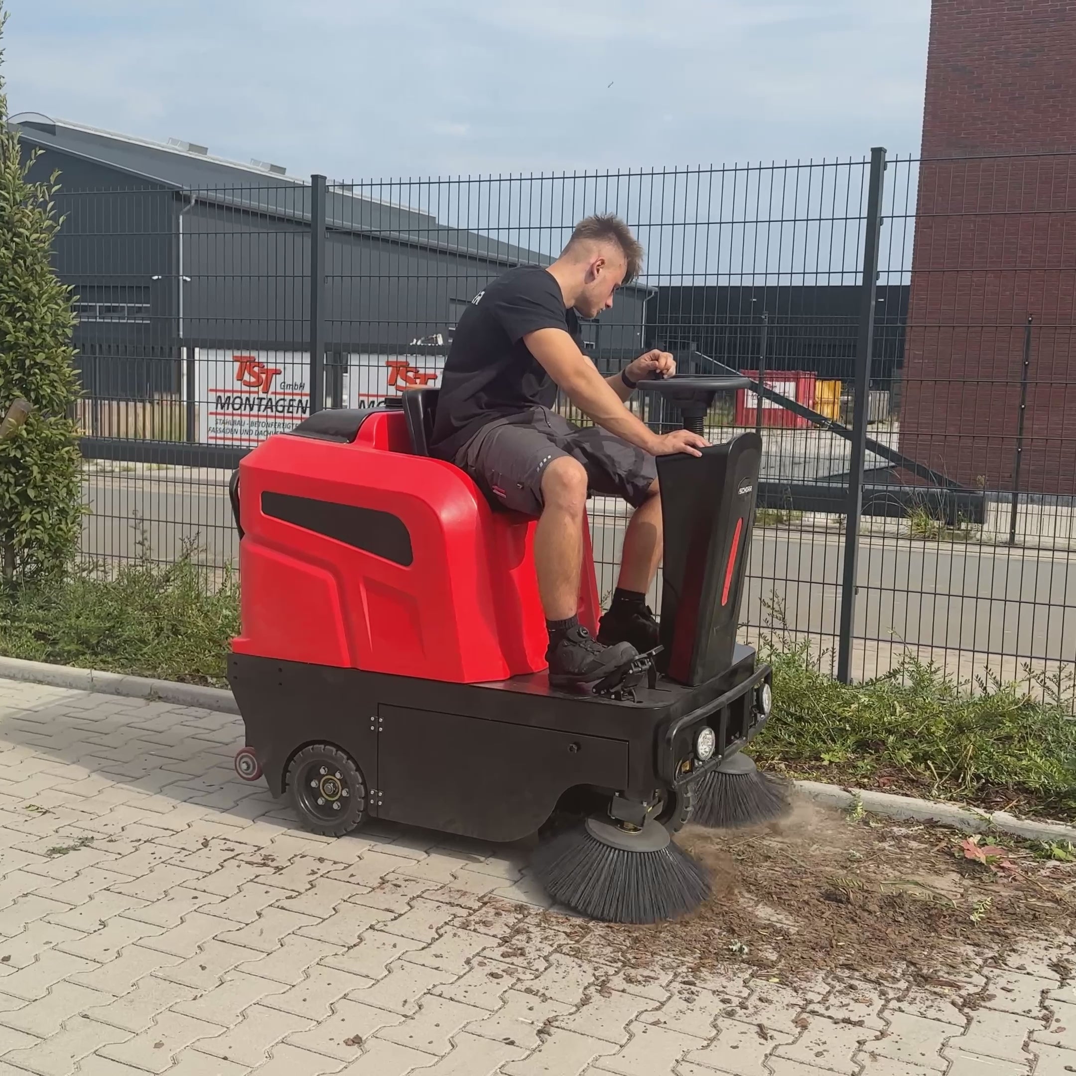 Leistungsstarke und laufruhige Aufsitzkehrmaschine für den Innen- und Außenbereich mit 1250mm Arbeitsbreite. Mit integrierter Absaugung und zuschaltbarer Spritzdüse.