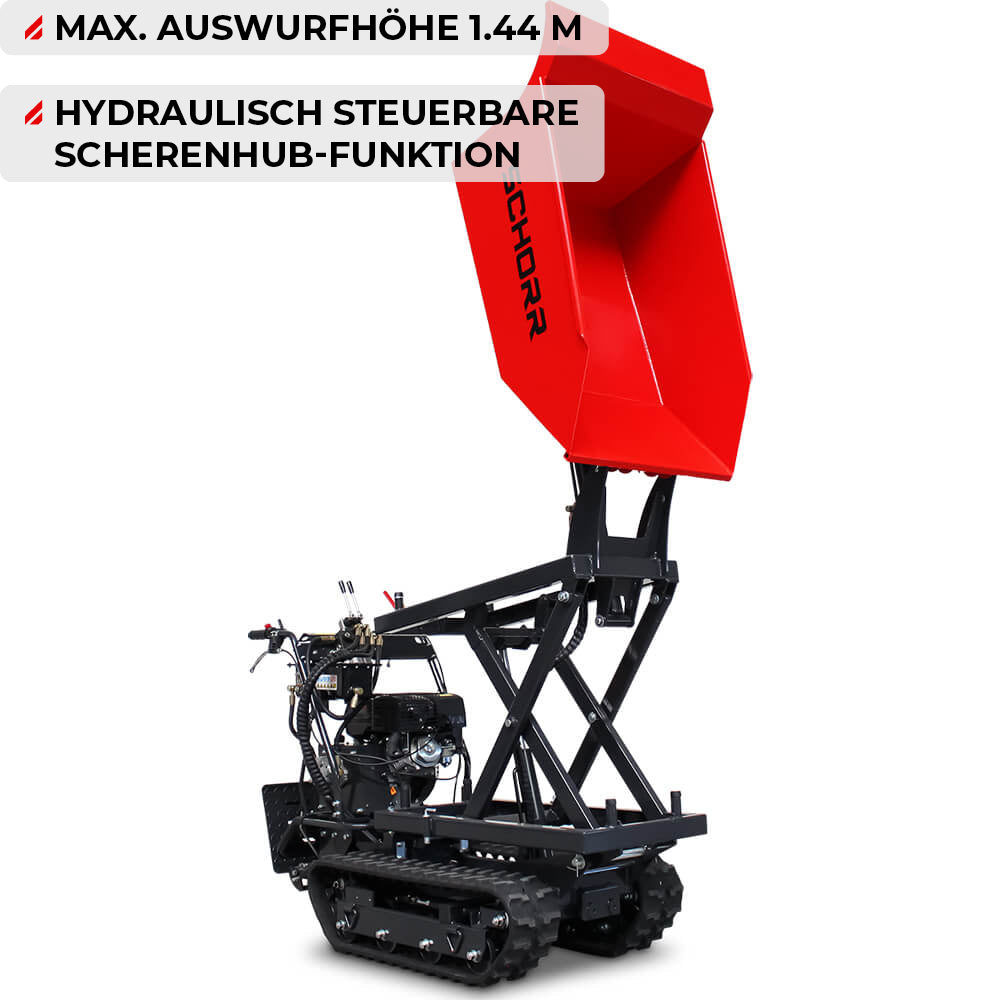 Der SCHORR Raupendumper RR500DHKAH verfügt über einen hydraulischen Kippantrieb und hat eine Nutzlast von 500 kg sowie einen leistungsstarken 9,2 PS Einzylinder 4-Takt Benzinmotor. Die Besonderheit des RR500DHKAH ist die hydraulisch steuerbare Scherenhub-Funktion. Mit dessen Hilfe können Sie das beförderte Material bis zu einer Höhe von 1,44m auswerfen -ideal für Anhänger oder sonstige höher gelegene Flächen. Dank seiner schlanken Bauweise (700mm) kann der Minidumper auch durch enge Wege und schmale Türen fahren, was ihn zu einem äußerst flexiblen Transportmittel macht.