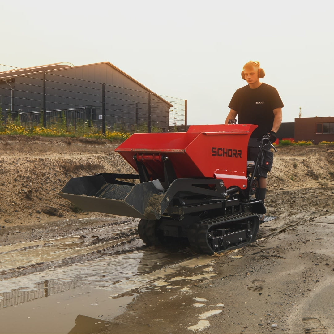 Der SCHORR Raupendumper RR500DHKASH verfügt über einen hydraulischen Kippantrieb und hat eine Nutzlast von 500 kg sowie einen leistungsstarken 9,2 PS Einzylinder 4-Takt Benzinmotor.